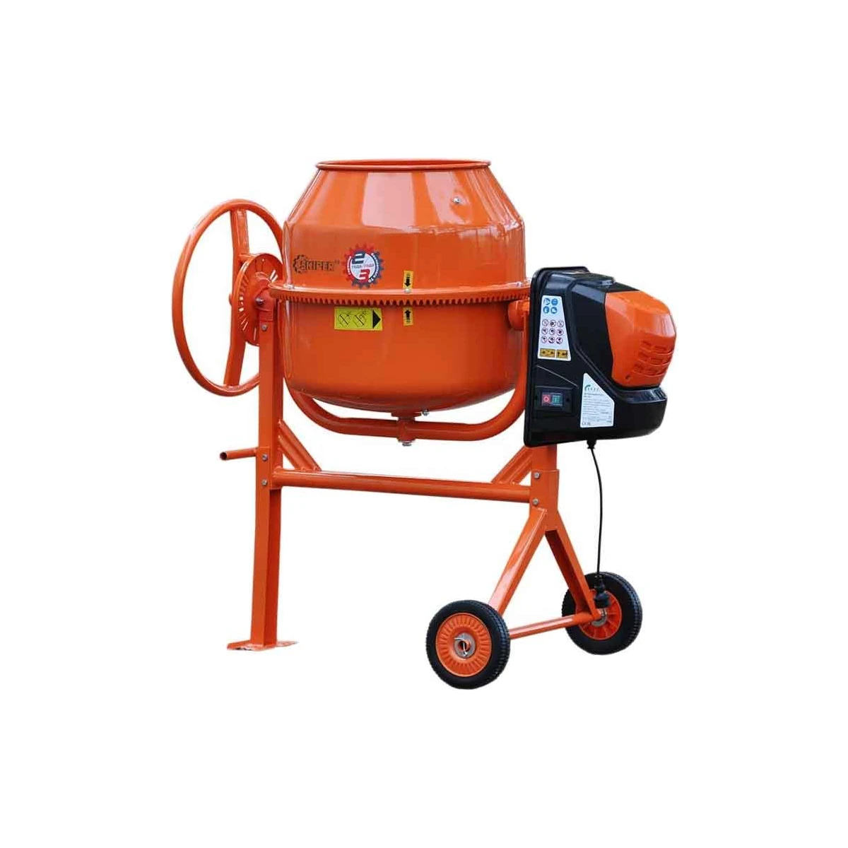 Оснащена надежным двигателем, ручным механизмом опрокидывания барабана. Чугунный венец, устойчивая крепкая рама – основные преимущества данной модели.