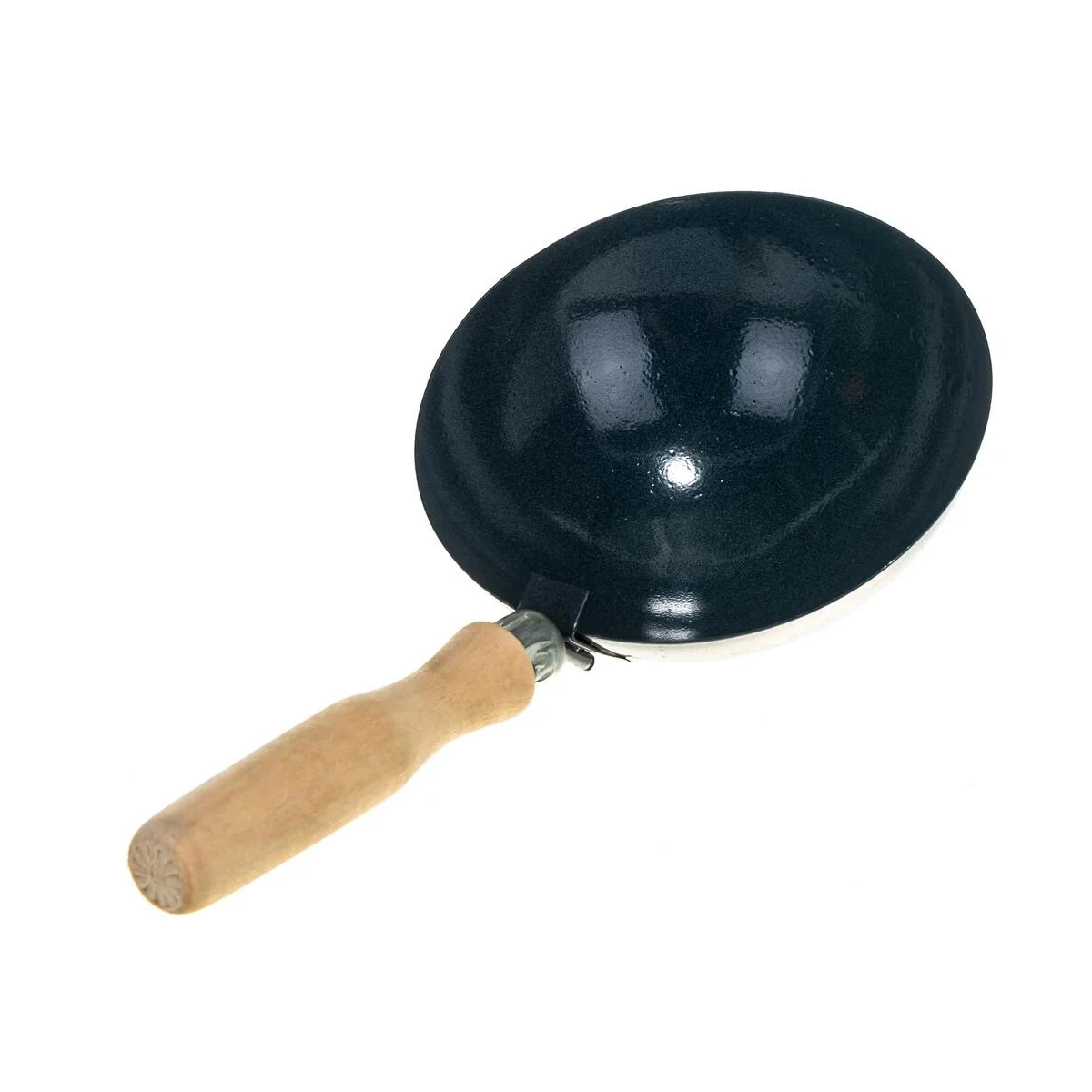 Стальной ковш в форме полусферы с деревянной ручкой.