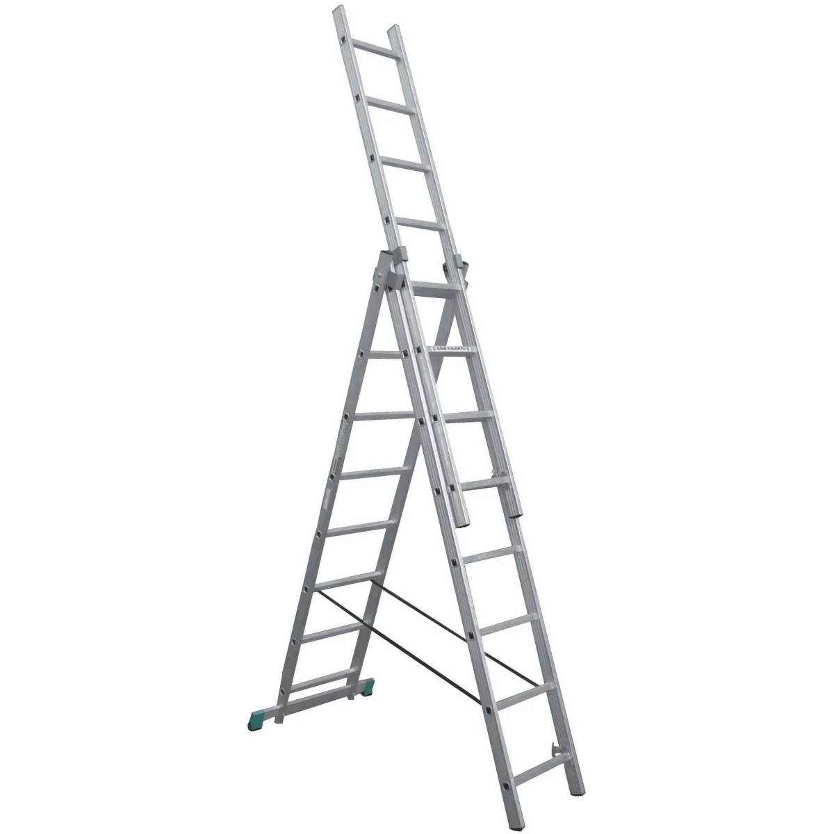 Общие характеристики: Тип: лестница-трансформер Количество ступеней: 33 шт Материал: алюминий Количество секций: 3 Двустороннее восхождение: есть Высота секции: 3160 мм Максимальная нагрузка: 150 кг Размеры и вес: Общая высота: 7150 мм Вес: 19.3 кг