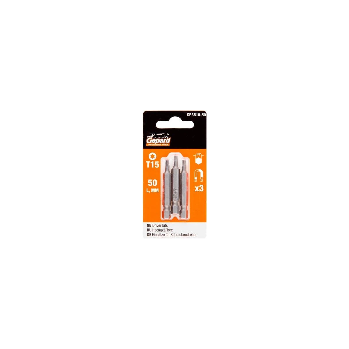 Бита для шуруповерта магнитная Torx T15 50 мм 3 штуки GEPARD (GP3518-50) - насадка-бита шестилучевая звезда (звездочка, TORX) односторонняя. Применяется в качестве сменной насадки к шуруповёрту и другим инструментам при монтаже и демонтаже саморезов в мягкие поверхности, дерево и металл. Выполнена из легированной инструментальной стали S2 с увеличенным содержанием ванадия.