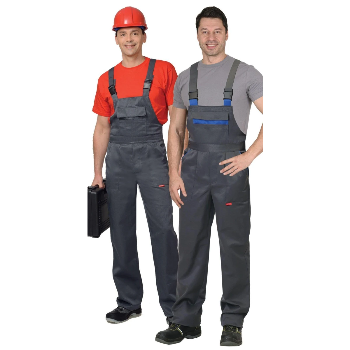Полукомбинезон с застежками на пуговицы: спереди на гульфик и в правом боковом шве. С различными карманами на передних и задних половинках. С двойным нагрудным карманом с клапаном на липучке. Сзади полукомбинезон по талии стянут резинкой для лучшего прилегания по фигуре. Бретели выполнены из резинки, длина бретелей регулируется при помощи застежек-фастексов. Полукомбинезон предназначен для защиты от общих производственных загрязнений и механических воздействий работников различных отраслей промышленности, агропромышленного комплекса, жилищно-коммунального хозяйства, организаций торговли, бытового обслуживания и гостиничного сервиса, сервисных и клининговых служб и т.д. Характеристики: Вид изделия: полукомбинезон. Пол: мужской. Сезон: лето. Ткань/материал верха: смесовая с ВО пропиткой. Состав: 80% ПЭ, 20% ХБ. Плотность/толщина материала: 190 г/м². Цвет: серый. Цвет отделки: васильковый. Размерный ряд: с 88-92 по 120-124. Ростовка: с 170-176 по 182-188.