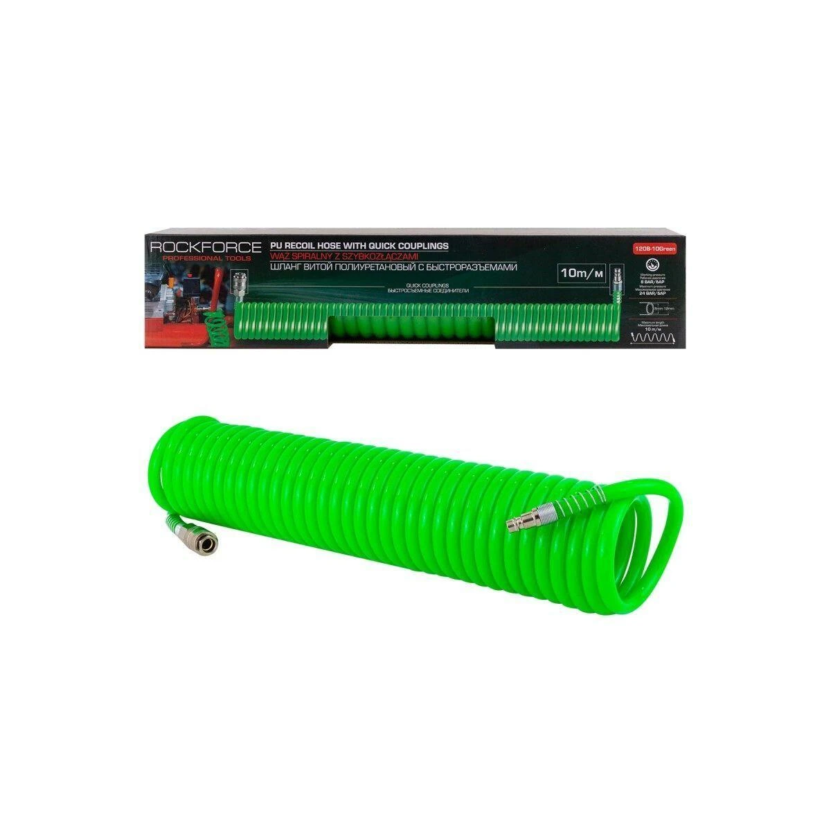 Полиуретановый витой шланг с быстроразъемами из нержавеющей стали является универсальным и подходит для большинства воздушных компрессоров и другого пневматического оборудования. Витая структура шланга обеспечивает его гибкость и помогает избегать защемления или закручивания, что делает его долговечным в использовании. На двух концах шланга присоединены латунные быстросъемные соединения. Максимальное допустимое давление - 24 бар, рабочее давление - 8 бар, рабочая температура от -20° до +60°. Внешний диаметр шланга 12мм Внутренний диаметр шланга 8мм Общая длина шланга 10м