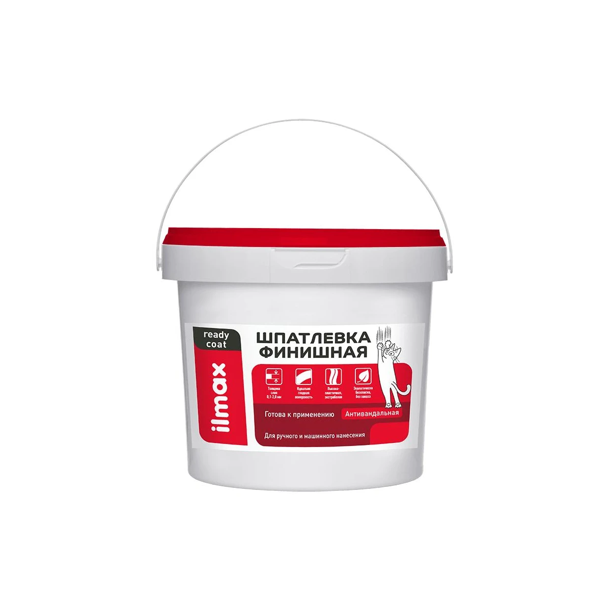 Антивандальная: имеет высокую прочность и стойкость к истиранию. ilmax ready coat шпатлевка финишная готова к применению. Для ручного и механизированного нанесения. Состав: дисперсия акрилового сополимера, минеральные наполнители, функциональные добавки, вода.
