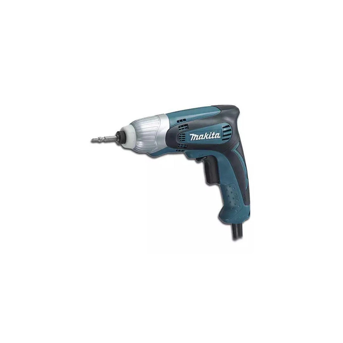 Сетевой ударный шуруповерт Makita TD0100 пригодится как в профессиональной деятельности, так и для бытового использования. Инструмент имеет очень скромные габариты (длина – 218 мм, высота – 180 мм) и весит менее килограмма. При этом он чрезвычайно эффективен в работе и без труда справится с ввинчиванием саморезов длиной до 90 мм, шурупов М8 и пр. Работоспособность данной модели обеспечивается компактным электродвигателем, потребляющем при максимальной нагрузке 230 Вт электроэнергии. При этом в совокупности с серией ударов обеспечивается крутящий момент, достигающий 100 Нм. Эргономичный, прекрасно сбалансированный инструмент не нагружает кисть, а из-за минимального реактивного момента, обусловленного характером завинчивания, при работе с «тугим» крепежом от пользователя требуется гораздо меньше усилий, чем при работе с обычным шуруповертом.