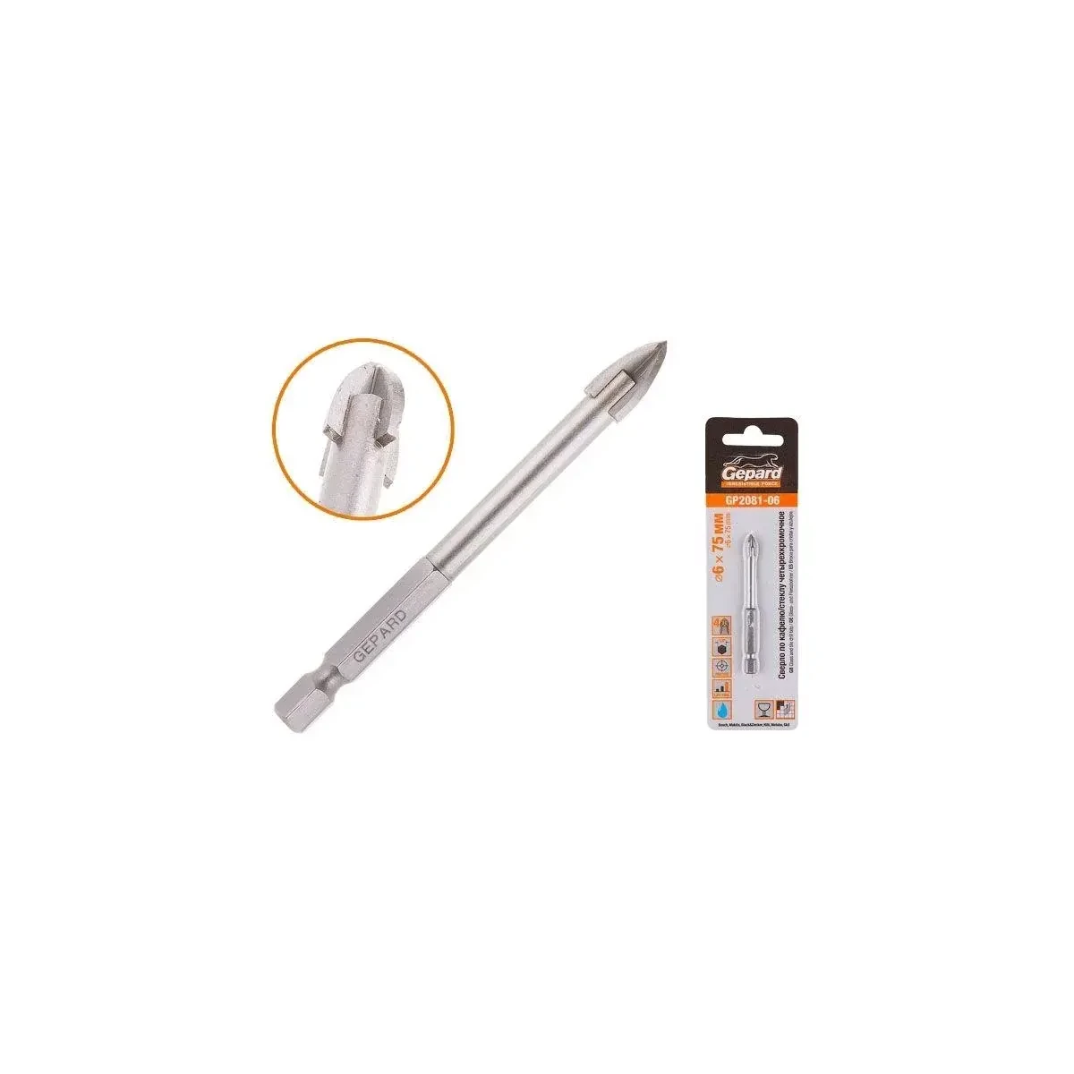 Технические характеристики: Тип и Назначение: сверло по кафелю, стеклу, керамической плитке. Повышенная точность и ресурс использования; Покрытие: полимерное для защиты от коррозии; Диаметр сверла, мм: 6; Общая длина сверла, мм: 75; Количество режущих кромок (резцов): 4; Тип хвостовика: шестигранный 1/4"; Количество в упаковке: 1; Рекомендации: при сверлении стекла и керамической плитки используйте сверло на минимальных оборотах и с охлаждением водой.