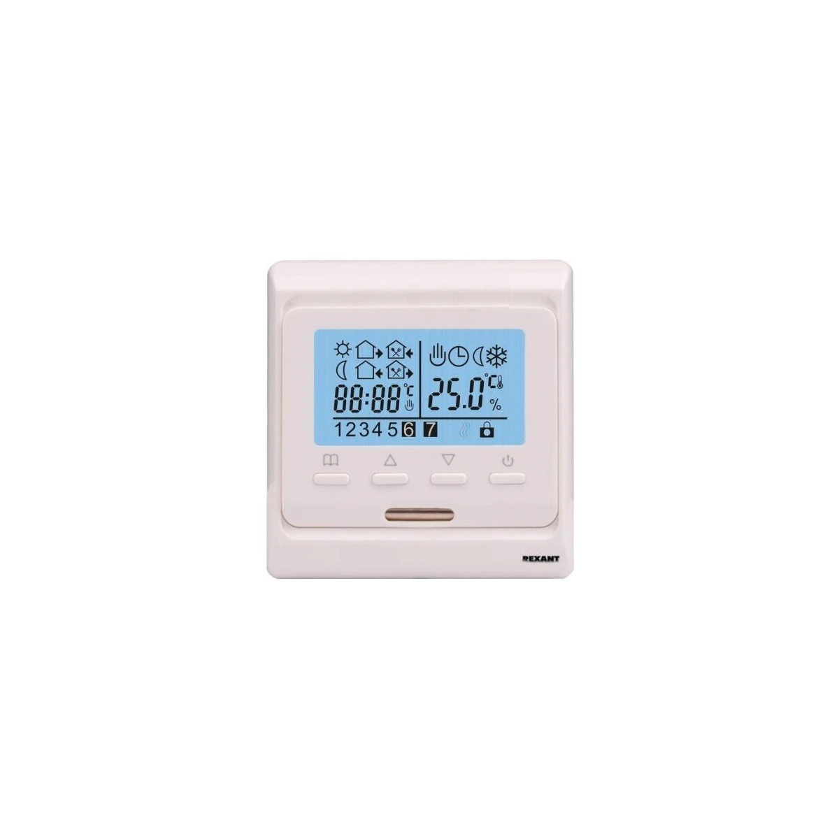 Терморегулятор REXANT R51XT белый (51-0532) позволяет значительно снизить энергопотребление теплых полов, путем поддержания комфортной температуры от +5°C до + 35°C по датчику температуры пола / воздуха / пола + воздуха, в рамках установленных временных интервалов и когда в этом есть необходимость. Графический дисплей с подсветкой и кнопками управления. Многорежимный термостат со встроенным блоком реального времени и календарем. Суточный цикл распределения комфортной температуры по времени. Пользователь задает временные интервалы в течение суток, когда ему необходим теплый пол. Управление: программируемое электронное. Рекомендован для установки с любыми системами напольного обогрева: теплые полы на основе резистивных кабелей, теплые полы на основе матов, инфракрасные пленочные полы.