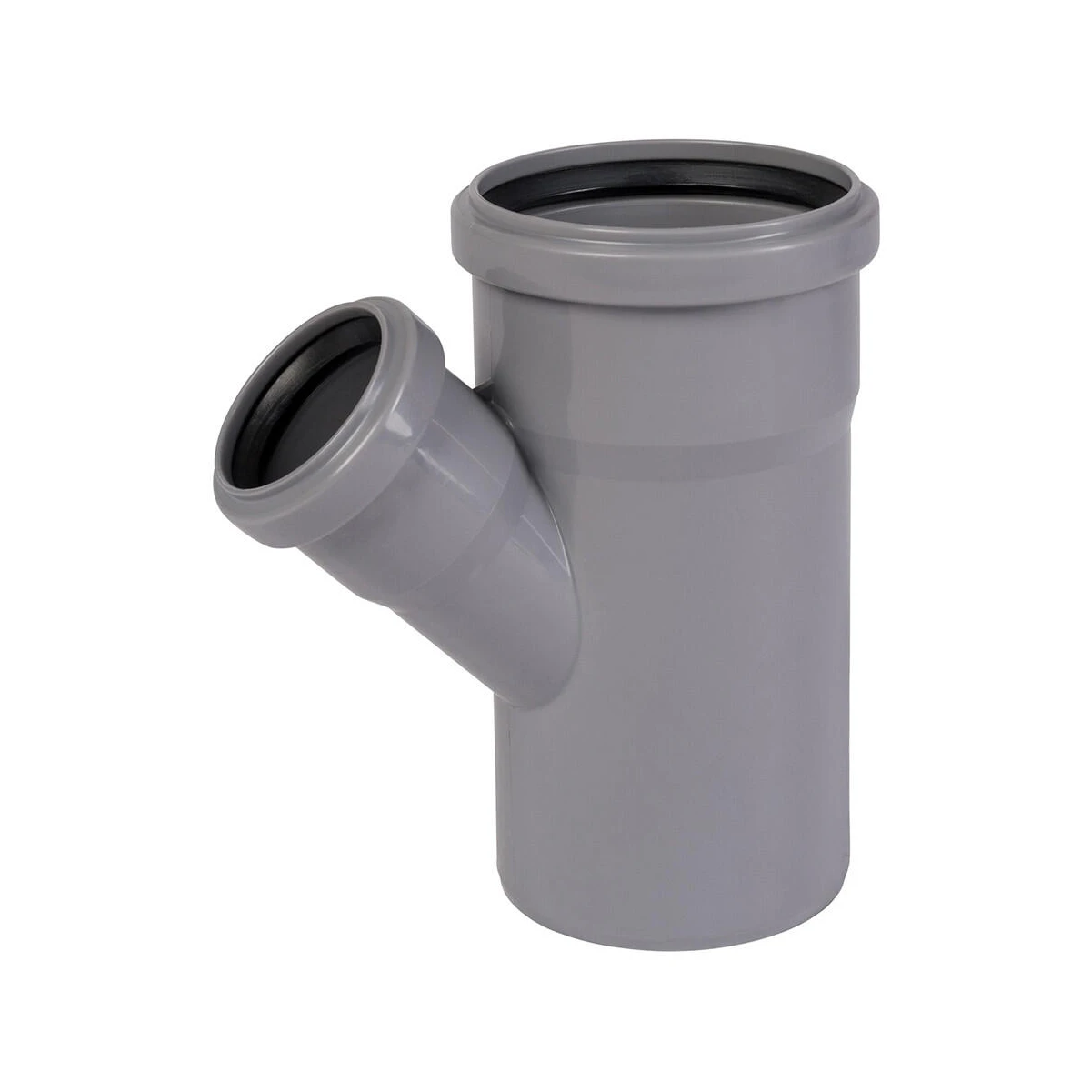 Предназначен для создания ответвлений в системах канализационных трубопроводов внутри помещений. Угол ответвления равен 45º. С помощью этого тройника осуществляется переход с канализационного трубопровода меньшего диаметра (50 мм) на трубу диаметром 110 мм. Раструб и канавка с уплотнительным резиновым кольцом есть с одной стороны тройника и на боковом ответвлении. Другая сторона вставляется в раструб трубы (или фитинга) соответствующего диаметра.