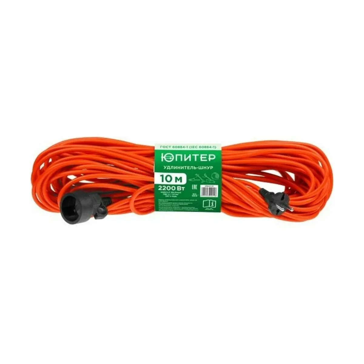 Удлинитель-шнур 10м (1 роз., 2,2кВт, б/з, ПВС 2х1) Юпитер, арт.JP8401-01